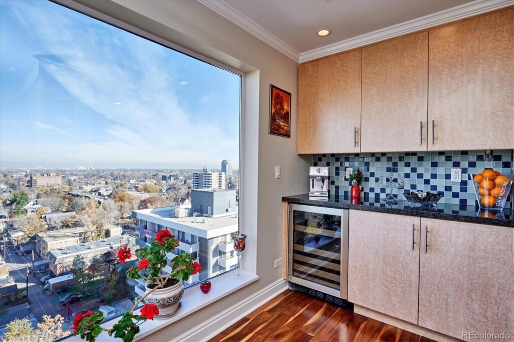 The park, front range mountain and Denver skyline views are captivating from this 14th floor home in the sky.