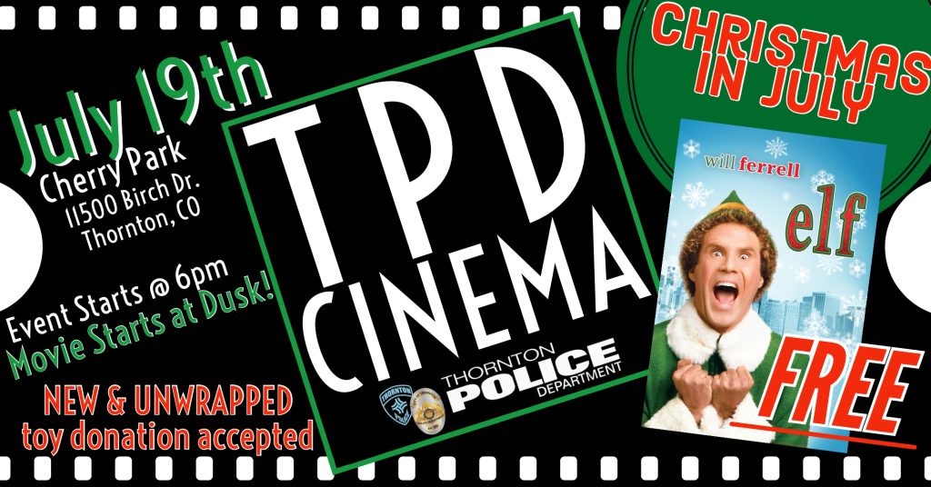 This weekend’s Movies in the Park will be hosted at the Cherry Park Pavilion in Thornton. Festivities kick off at 6:00 PM and the movie will begin at dusk. Seating is on a first-come, first-served basis — so arrive early to get the best spot! Attendees are asked to leave glass bottles, alcohol, tobacco, and grills at home. Pups are allowed, though these movie-loving canines are required to be on a leash. As part of the Christmas in July event, the movie being shown will be Elf. Families who want to donate to a good cause are asked to bring new and unwrapped toys to the movie for Thornton PD’s drive.
