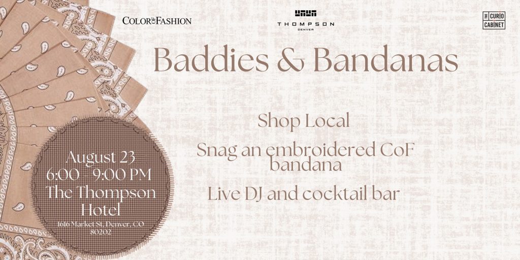 Join The Curio Cabinet Magazine and Color of Fashion at the Thompson Denver this Saturday for Baddies & Bandanas, which is marketed as an exclusive prelude to “Color of Fashion Season V: Be Scene” this September. From 6:00 PM to 9:00 PM this Saturday, enjoy an exclusive gathering of fashion lovers looking to shop, sip, and mingle. You’ll also have the opportunity to get your hands on a limited-edition Mocha Mousse CoF embroidered bandana for just $7! Each bandana purchase will enter your name into a raffle to win a free ticket to the runway show, and there will only be 50 available, so come early! Peruse the offerings from standout local vendors while you vibe to a live vinyl DJ spinning great tunes.