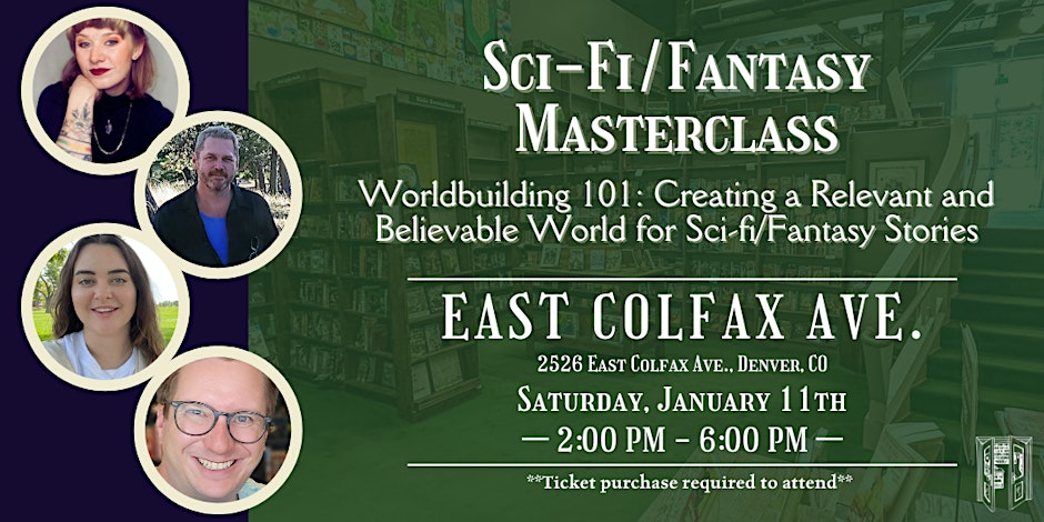 This Worldbuilding 101 Free Masterclass will be hosted at Tattered Cover on Colfax. Interested parties can enjoy a presentation of skilled authors who will discuss how to create a relevant and believable world for sci-fi and fantasy stories. This Saturday from 2:00 PM to 6:00 PM, meet local independent authors who are eager to share their knowledge on the sci-fi/fantasy writing world and help world-build stories from audience members. Each author will present for approximately 30 minutes and there will be a Q&A after the presentations, as well as an opportunity for meet and greets.